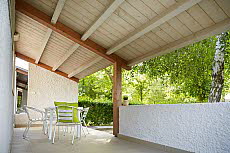 Typ C5: 3-Zimmer-Reihenhaus für max. 6 Personen, renoviert, inmitten einer Grünfläche. Wohn-/Schlafraum mit Doppelcouch, Küchenzeile, Essplatz, 2 Doppelzimmer oder Zweibettzimmer, Dusche/WC. Möblierte Terrasse mit kleinem, privaten Garten, überdachter Autostellplatz am Haus.