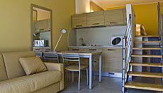 Typ BV: 1;5 Zimmer Wohnung für 4 Personen ca. 30-35 qm; Wohn-/Schlafraum mit Doppelcouch, Doppelbett auf offener Galerie, Bad mit Dusche oder Badewanne, kleine Terrasse.