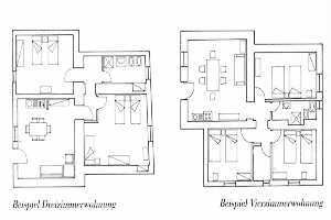 Typ QC: 4-Zimmer-Wohnung "Classic" für 6 Personen im OG; Wohnküche mit Essplatz, 2 Doppelzimmern, Zweibettzimmer mit Stockbetten, Dusche/WC/Bidet, gemeinsamer Gartensitzplatz.