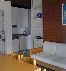 Typ A: 1-Zimmer-Wohnung für max. 2 Personen, ca. 24 qm; Wohn-/Schlafraum mit Doppelcouch bzw. Einzelcouch und Schlafsessel, Küchenzeile, Essplatz, Dusche/WC, Balkon.